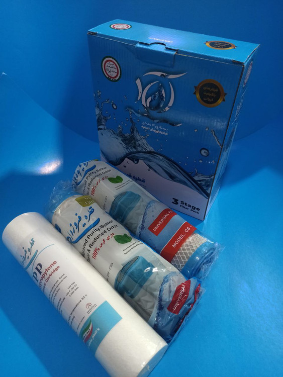 :فیلتر مرحله یک pp =این فیلتر با مش ۵ میکرون حذف ذرات معلق، زنگ آب را بر عهده دارد -فیلتر مرحله دو کربن پودری= وظیفه حذف کلر موجود در آب بو و طعم نامطبوع و آلودگی های زیستی -فیلتر مرحله سوم کربن بلاک= وظیفه حذف رنگ و طعم نامطبوع آب